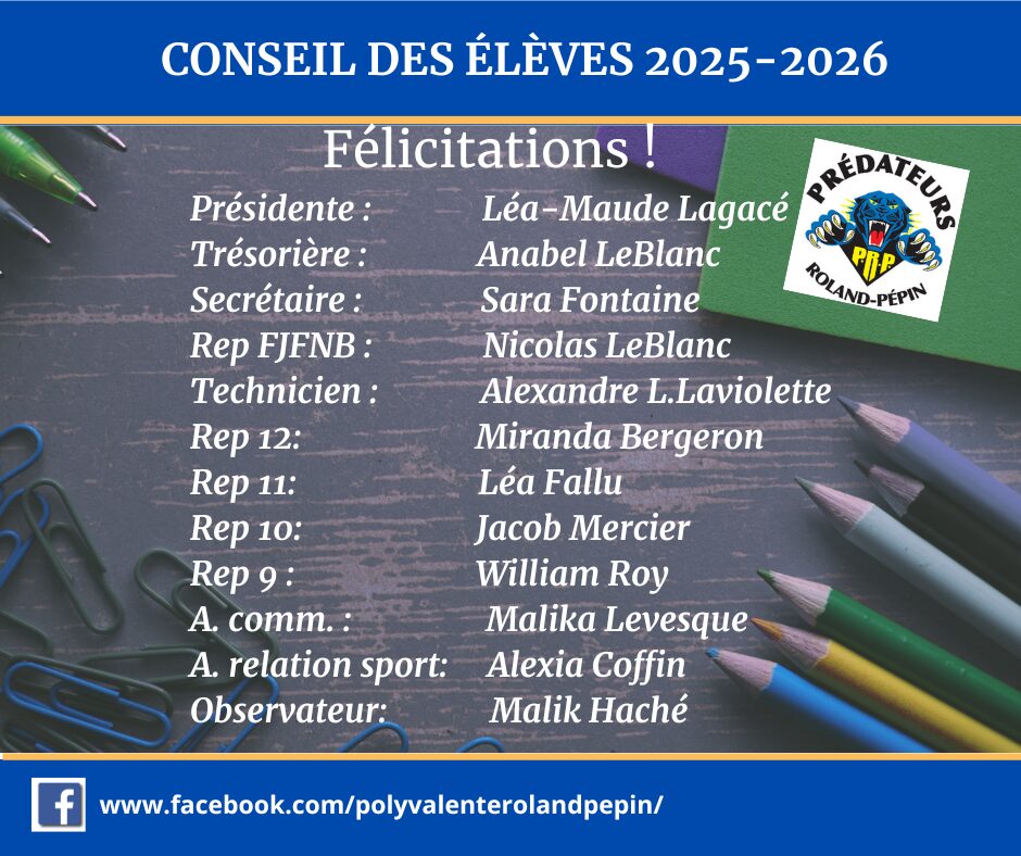 Le conseil des élèves est une organisation composée d’élèves qui participent à la vie de l’école. Le conseil permet à tous les élèves de donner un sens à leur vie à l’école en favorisant des activités dans les domaines suivants : événements sociaux, culturels et sportifs, esprit civique, communications, relations avec les enseignants, services communautaires et autres.